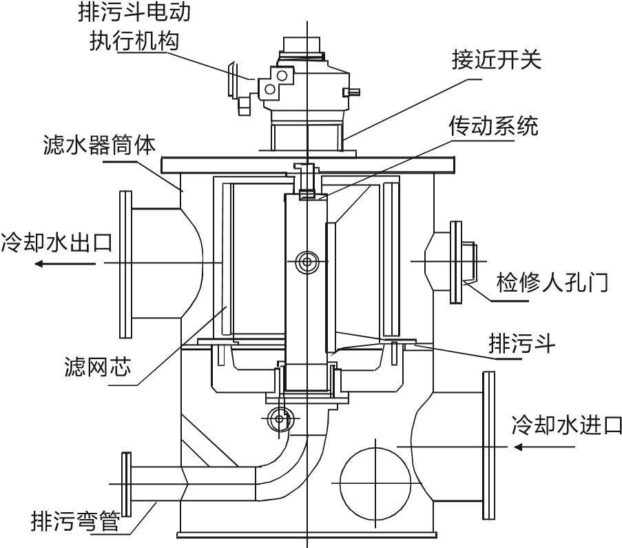 不影響機(jī)組正常供水。為完全實(shí)現(xiàn)電廠提出的“無(wú)人值班”(少人值守)要求,濾水器需達(dá)到全自動(dòng)、免除人工清洗,保證能在較長(zhǎng)時(shí)間無(wú)維修、無(wú)檢查的條件下正常工作,而且還應(yīng)具有定時(shí)運(yùn)行、高差壓自動(dòng)反洗、遠(yuǎn)程DCS控制、人工就地自動(dòng)操作、就地手動(dòng)操作、故障報(bào)警和手/自動(dòng)切換等多種功能,以滿足不同工況下對(duì)供水排污的要求。其結(jié)構(gòu)如圖1所示。
