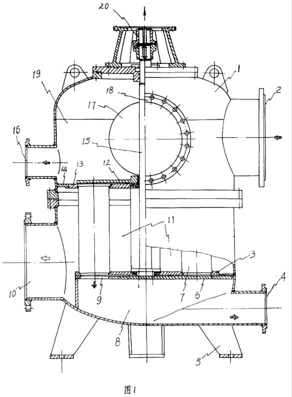 三個(gè)腔體,其中上部為進(jìn)水及排污腔,中部為帶上、下轉(zhuǎn)板的過濾腔,