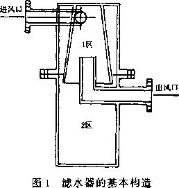工業(yè)自動濾水器的基本構造如圖1所示,當壓力風從進風口進入工業(yè)自動濾水器之后(進入1區(qū)),在工業(yè)自動濾水器中臺體的導流下沿筒壁高速旋轉,當到達中間的部位時壓力風的旋轉速度達到大,到了工業(yè)自動濾水器的下部分(2區(qū))之后形成一個渦流區(qū),使壓力風和液態(tài)水及雜質分離,壓力風凈化上行,通過出風口沖出去,液態(tài)水和雜質存貯在工業(yè)自動濾水器的下部容器中,一個班結束后打開排污閥,排除水及雜質,并沖凈了工業(yè)自動濾水器。