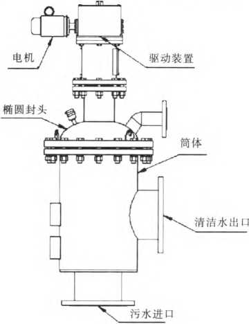 圖1為立式自清洗過濾器【反沖式自動(dòng)濾水器】的總體結(jié)構(gòu),主要包括一個(gè)濾筒,吸污裝置和驅(qū)動(dòng)裝置和反沖洗濾芯。表1過濰器設(shè)計(jì)的技術(shù)件數(shù) 圖1立式自清洗過潼器的總體結(jié)構(gòu)