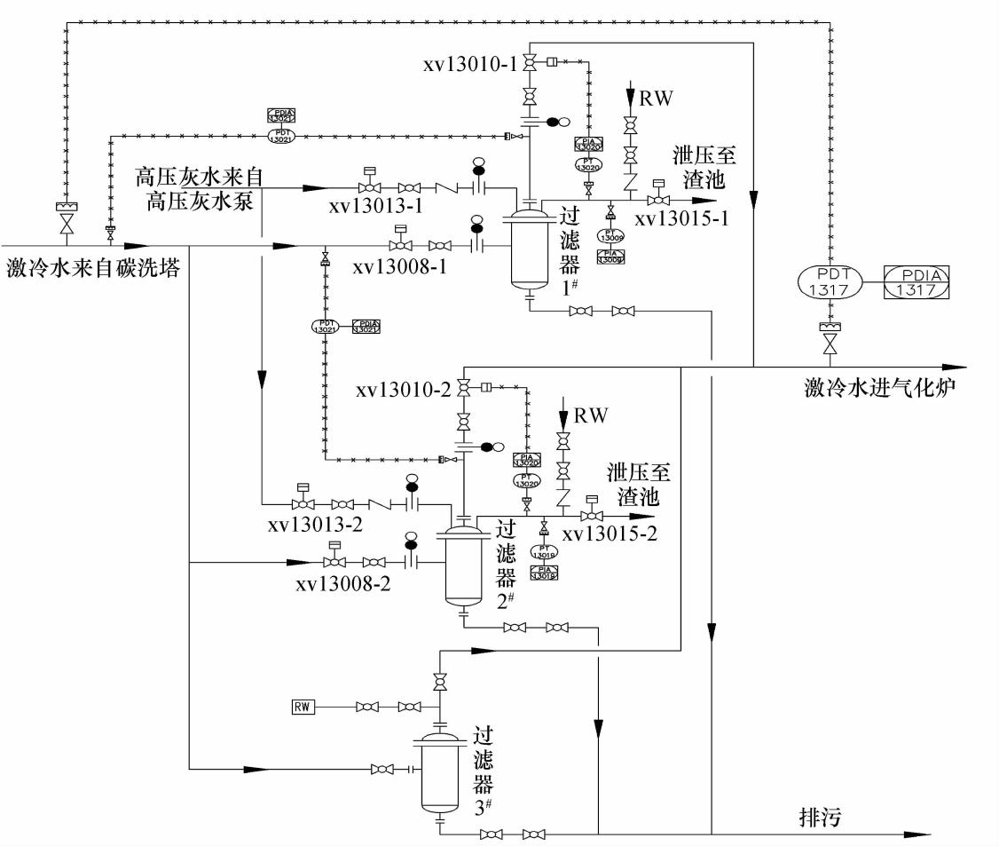煤炭氣化是傳統(tǒng)的煤化工產(chǎn)業(yè),隨著社會(huì)經(jīng)濟(jì)的不斷發(fā)展,它們將進(jìn)一步得到發(fā)展.我公司自主研發(fā)的水煤漿水冷壁氣化爐日處理煤750t,氣化爐采用水冷壁代替耐火磚、燒嘴使用火點(diǎn)火等特點(diǎn)。制得的煤氣中有效氣體(CO+H2)體積分?jǐn)?shù)≥80.7%,碳轉(zhuǎn)化率達(dá)98.0%,噴嘴使用壽命超過(guò)6個(gè)月,含渣黑水大部分循環(huán)使用,少量排放的廢水沒(méi)有揮發(fā)性有機(jī)物,微量金屬的濃度也很低。缺點(diǎn)是管道冷卻水經(jīng)過(guò)手動(dòng)工業(yè)濾水器+手動(dòng)排污濾水器進(jìn)入氣化爐,管道冷卻水中的大量灰渣沉積在手動(dòng)工業(yè)濾水器+手動(dòng)排污濾水器底部,而這些灰渣只有在停車的時(shí)候才可以清理。如果系統(tǒng)運(yùn)行時(shí)間過(guò)長(zhǎng),灰渣得不到清理,管道冷卻水水質(zhì)變差,對(duì)激冷環(huán)的磨損加劇,同時(shí)管道冷卻水中攜帶的灰渣容易堵塞激冷環(huán)下降孔,破壞下降管水膜,嚴(yán)重時(shí)可燒壞下降管,引起事故發(fā)生。為了克服水煤漿氣化工藝連續(xù)運(yùn)行時(shí)不能對(duì)手動(dòng)工業(yè)濾水器+手動(dòng)排污濾水器進(jìn)行清灰這一不足,本方案在原有工藝基礎(chǔ)上新增加一臺(tái)手動(dòng)工業(yè)濾水器+手動(dòng)排污濾水器,共3臺(tái)手動(dòng)工業(yè)濾水器+手動(dòng)排污濾水器,兩開(kāi)一備,輪流進(jìn)行清灰。