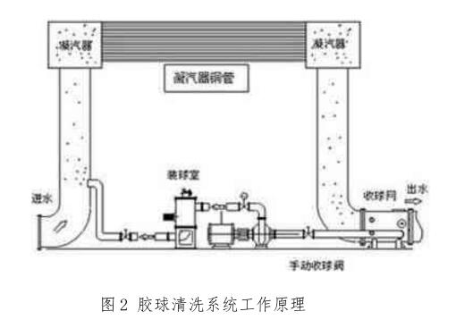 為了保持凝汽器銅管有較高的清潔系數(shù),減輕銅管的結(jié)垢,提高傳熱效率,保證凝汽器真空度,原#1機(jī)組凝汽器兩側(cè)的循環(huán)水進(jìn)、出水管各裝設(shè)了一套膠球清洗裝置系統(tǒng)。該系統(tǒng)是由裝球室、膠球泵、收球網(wǎng)、管道及相關(guān)閥組成的獨(dú)立系統(tǒng),(工作原理如圖2所示)。