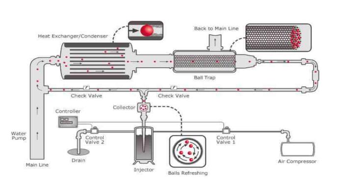 在現(xiàn)代大型電站凝汽式汽輪機(jī)組的熱力循環(huán)中,凝汽設(shè)備起著冷源的作用,其主要任務(wù)是將汽輪機(jī)排汽凝結(jié)成水并在汽輪機(jī)排汽口建立與維持一定的真空度。凝汽器內(nèi)冷卻水管的干凈程度直接影響凝汽器的凝結(jié)效率。在機(jī)組運(yùn)行過程中,凝汽器常用投膠球清洗裝置來實(shí)現(xiàn)冷卻管干凈的目的,在停機(jī)狀態(tài)下,則可以采用機(jī)械或化學(xué)方式清洗,使凝汽器冷卻水管保持清潔。凝汽器結(jié)垢形成的熱阻與清洗成周期性變化。一般大型發(fā)電廠都安裝凝汽器膠球清洗裝置系統(tǒng),在線膠球清洗裝置系統(tǒng)的結(jié)構(gòu)和原理比較簡(jiǎn)單,但整套膠球清洗裝置系統(tǒng)在運(yùn)行中往往很難達(dá)到預(yù)期的效果。現(xiàn)在大型火力發(fā)電廠汽輪機(jī)凝汽器膠球清洗裝置系統(tǒng)。