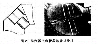 在冷凝器人口水室死角加裝導(dǎo)流板,以防止管道堵球及水室死角滯球現(xiàn)象。而針對(duì)導(dǎo)流板存在的
