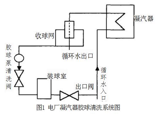 電廠凝汽器膠球清洗裝置系統(tǒng)如圖1所示。密度與水相近的海綿膠球(用天然橡膠或合成樹脂制成)裝入球室后,啟動(dòng)膠球泵可以將膠球用比循環(huán)水壓力高的水流送入凝汽器水室。膠球直徑雖比銅管內(nèi)徑大1~2mm,但因是多孔柔軟的彈性體,很容易被水流帶入銅管,并被壓縮成卵形。膠球在行進(jìn)過程中抹去管壁上的污垢,流出管壁時(shí),依靠自身的彈力彈掉表面的污垢,并隨循環(huán)水流人收球室,然后被膠球泵重新送入凝汽器。