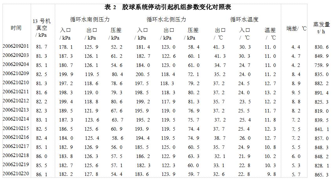 13號(hào)機(jī)膠球清洗裝置自2014年大修以來,投運(yùn)一直正常,從2016年9月份開始,13號(hào)機(jī)南側(cè)膠球裝置裝球室切換閥壞導(dǎo)致無法投運(yùn),于10月13日修好后投入運(yùn)行。9月2日北側(cè)膠球投運(yùn)后發(fā)現(xiàn)凝結(jié)水質(zhì)惡化,硬度為3μmol/L,故停止其運(yùn)行,只陸續(xù)在9月5日、11日、17日投運(yùn),且時(shí)間控制在30min左右,北側(cè)膠球的近一個(gè)月的停運(yùn),機(jī)組端差、真空出現(xiàn)明顯變化。表2為膠球系統(tǒng)停運(yùn)引起機(jī)組主參數(shù)變化的情況。