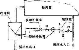 將膠球投放到裝球室里,通過膠球輸送泵升壓,膠球隨同水流打入循環(huán)水入口管道,進(jìn)入凝汽器銅管,并將管壁內(nèi)污垢沖刷下來,帶出管外,從而提高了管子的傳熱性能。清洗銅管后的膠球又隨水流進(jìn)入循環(huán)水出口管道,流入收球網(wǎng),然后膠球經(jīng)過匯集室回到膠球輸送泵入口,升壓后再回到裝球室內(nèi),完成一次清洗循環(huán)(見圖1)。