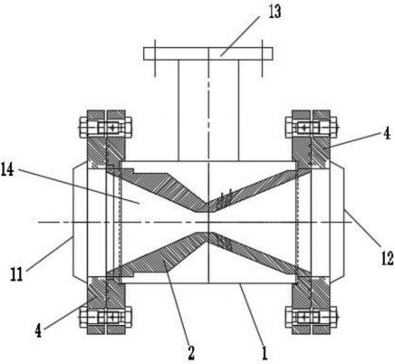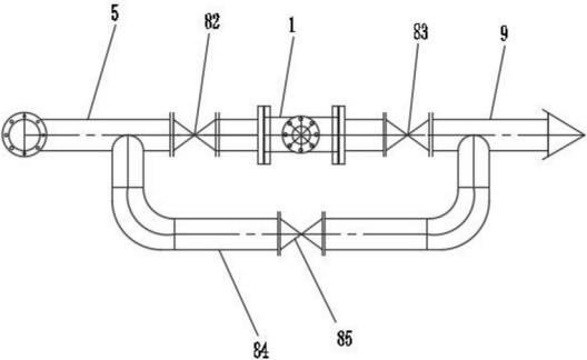 其中,1、本體,11、進(jìn)水口,12、出水口,13、信號(hào)口,14、調(diào)節(jié)流道,2、節(jié)流孔板,3、漸縮板,4、連接法蘭,5、液相管,6、汽相管,7、加熱器,81、一調(diào)節(jié)閥,82、二調(diào)節(jié)閥,83、隔離閥,84、調(diào)節(jié)管,85、旁路調(diào)節(jié)閥,9、排液管。