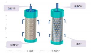 精密過(guò)濾單元反沖時(shí)濾芯擴(kuò)大間隙,已過(guò)濾的凈液(氣)反向由濾芯內(nèi)部向外流動(dòng),卡在間隙中的顆粒和濾芯外表面上堆積的固體顆粒被徹底地沖洗掉(見(jiàn)下圖b)。