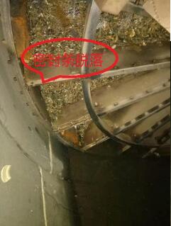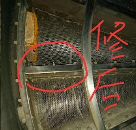 3.2019年11月底機(jī)組D修期間,循環(huán)水系統(tǒng)防水后檢查發(fā)現(xiàn)二次濾網(wǎng)回轉(zhuǎn)機(jī)構(gòu)一隔板變型,將二次濾網(wǎng)密封條刮脫,造成二次濾網(wǎng)前后差壓減小,反沖洗效果差,長(zhǎng)時(shí)間運(yùn)行后雜物堵塞二次濾網(wǎng),如圖4、圖5所示,但機(jī)組啟動(dòng)后仍存在循環(huán)水二次濾網(wǎng)差壓高現(xiàn)象。