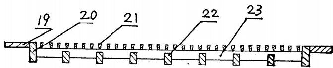 圖中:1膠球引出管、2網(wǎng)板旋擺支座、3、13連桿、4曲柄、5曲柄軸、6導(dǎo)流板、7網(wǎng)板轉(zhuǎn)軸、8網(wǎng)板、9筒體、10、17限位件、11、14手動(dòng)操縱件、12、16鎖定件、15電動(dòng)機(jī)、18蝸輪蝸桿減速器、19固定條、20、22筋板、21楔形篩條、23支承梁。